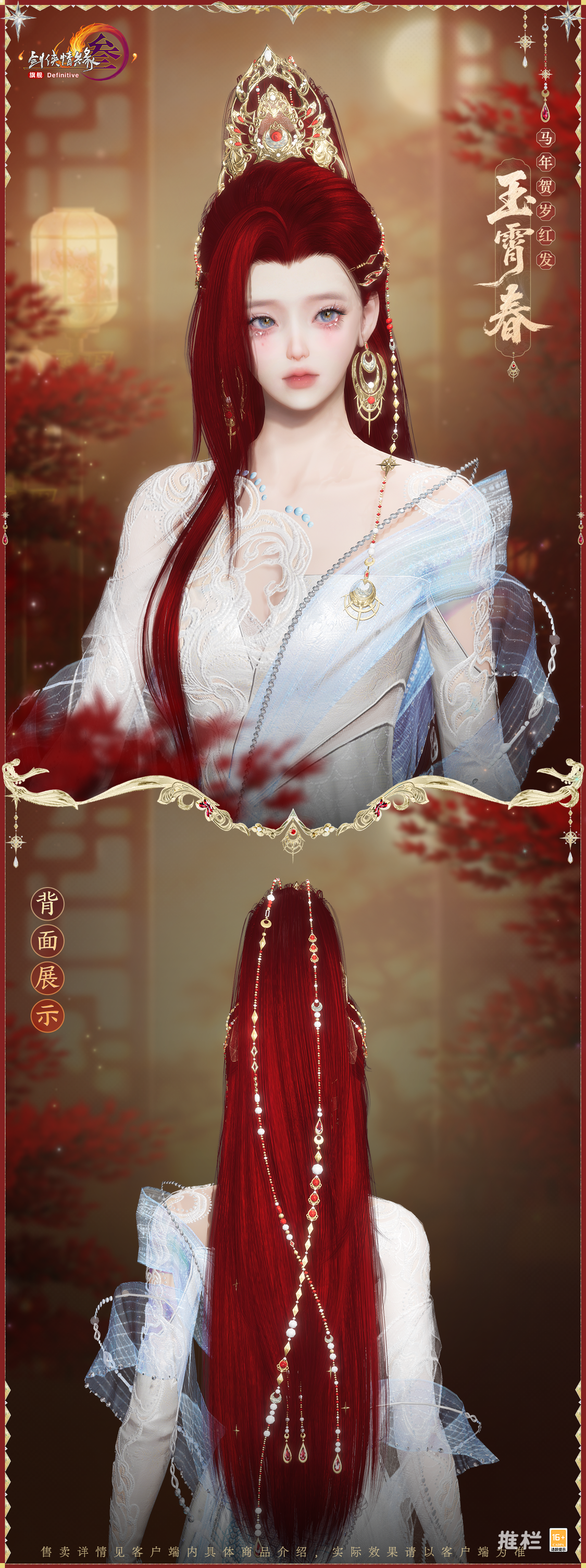 踏春归玉阙,垂影落华冠。马年贺岁红发“玉霄春”凝丹霞炽艳,自鎏金宝冠间倾泻如瀑,光泽流溢。冠珥巧饰,缠金衔红,金缕珠链似天河碎影,曜日流光相映生辉,俨然仙阙来客,瑞气盈身,矜贵不凡。