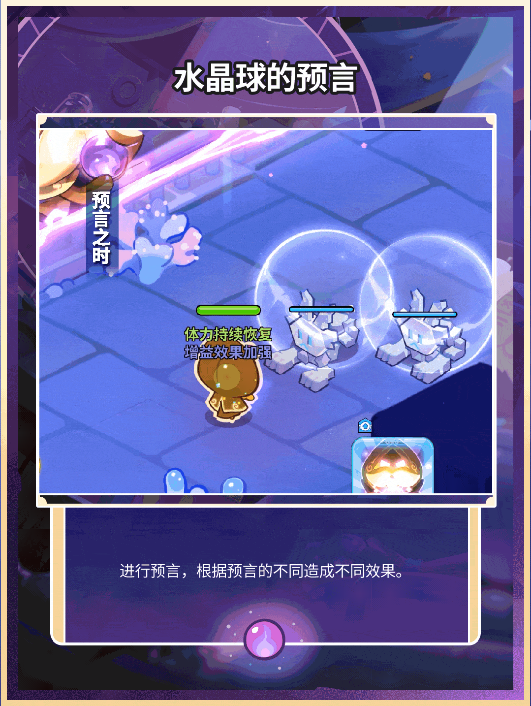 通过预言触发不同的效果及伤害,可根据配料会心率的尾数,来锁定固定的预言效果。预言家饼干在王国时每三天会出现幸运对话框,进行对话可获取奖励,星级越高奖励越稀有。