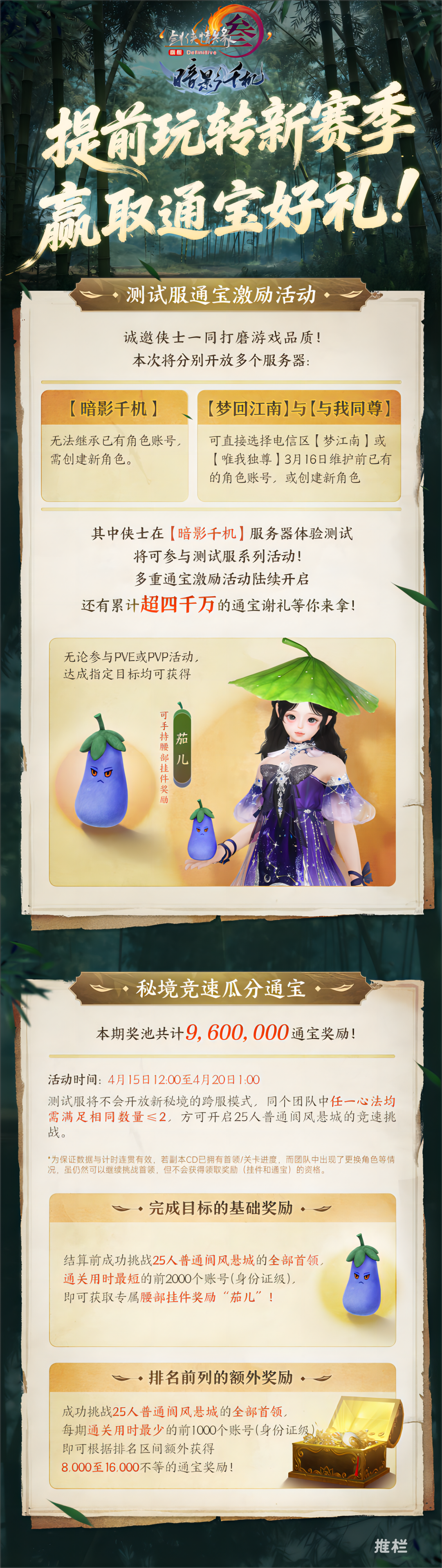 与此同时,测试服10人与25人普通难度“阆风悬城”的五号首领开放挑战!新一轮通宝激励即将上线,全新玩法“扬刀大会·影”闯关有奖,万物互联端名剑大会通宝激励活动同步开启!侠士使用移动端或极速端完成目标即可获得专属腰部挂件奖励“茄儿”与平分1500000通宝奖池,精彩好礼不容错过!