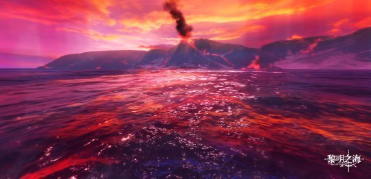 当你正前往未知港口时,你的船只驶过喷发的火山,冲天的火光与晚霞交织,天地都被染成一片血红。