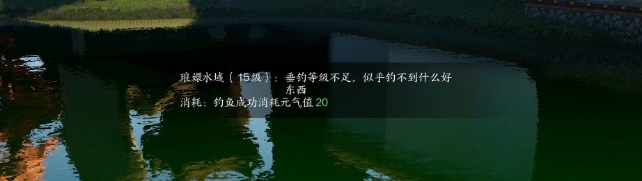 不同的水域有对应的垂钓等级要求,不到对应等级会有提醒,每次垂钓消耗20元气。