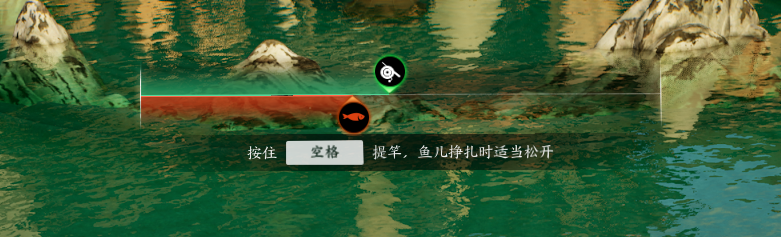 收杆后会出现一个进度条,上面是收杆进度,下面是鱼逃脱进度,绿色先到达终点就钓鱼成功,鱼先到达终点就失败,鱼挣扎会抖动,松开【空格】等鱼不挣扎再继续,直至完成。
