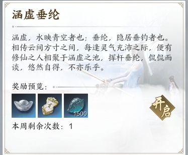 首先就是各类鱼获了,可以作为烹饪的食材,也是一些任务的道具,在本次测试中,最重要的还是帮派活动涵虚垂纶,帮主开启活动后前往云浮仙居的涵虚池处使用仙池佳饵进行垂钓,钓起活动指定鱼就算成功参与,给不少帮派灵气和帮贡。