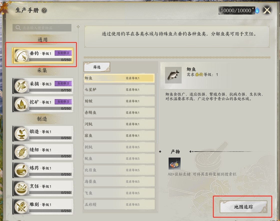 大家可以按【\】打开生产手册,查看各类鱼的出没地点和时间,点地图追踪前去垂钓。