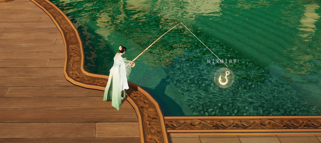 按下【空格】抛竿,按住不动可蓄力远抛,当出现一个鱼钩图标时,就可以按住【空格】开始收杆了。