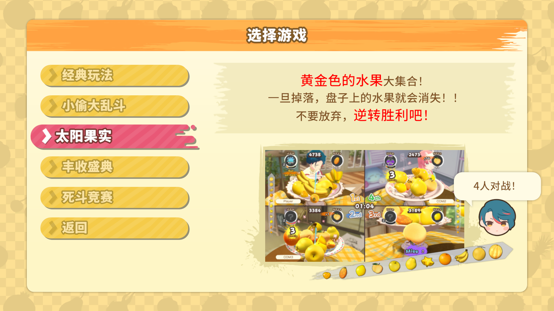 「丰收盛典」为时 4 分钟的积分比拼模式,比赛结束时积分最高者获胜。然而,与「经典玩法」不同的是——一旦水果掉出盘外即刻淘汰,你的分数将在当下冻结,且无法继续参战。