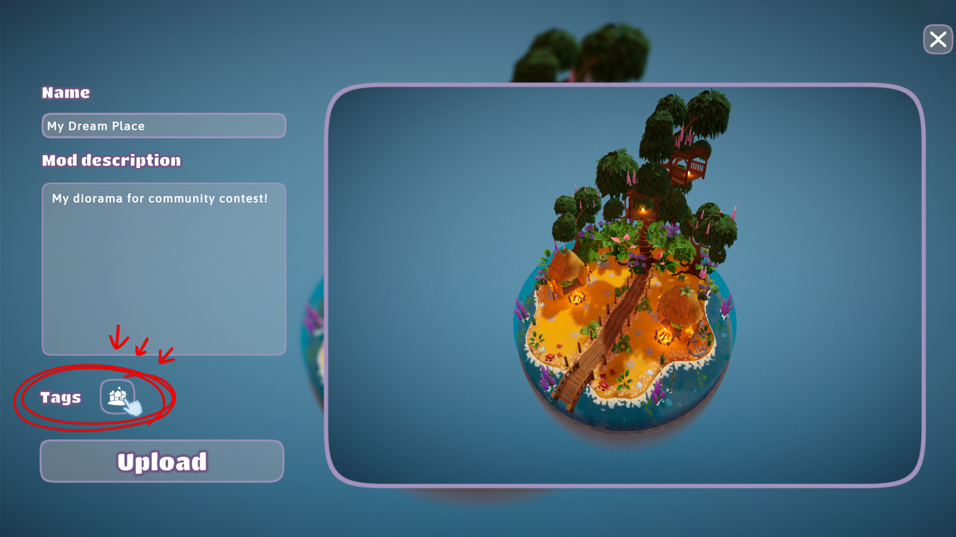 将完成的微缩景观上传至,包括展示作品的截图,并在上传过程中选择"我的梦想之地"标签。 📸