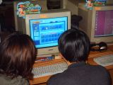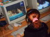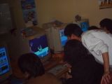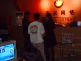 在上海的同济大学分部齐心网吧,很多玩家早早的开始排队等候活动,活动一开始所有机器被一抢而空。这是大屏幕开始放韩国高手录象,其他没有机器位置的都围到了屏幕前观看韩国高手的录象。而今天的活动,有很多MM被虫虫可爱有趣的游戏吸引过来来参与活动呢,她们学习虫虫的基本操作,打起来还真不比男生含糊。
