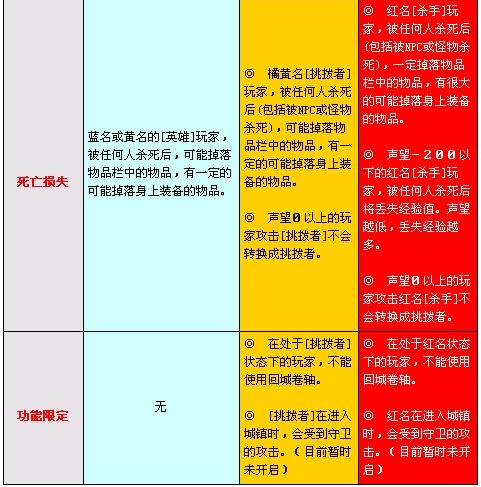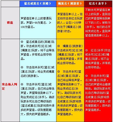 杀死[蓝名或黄名]玩家会导致自己声望值减少。高级玩家杀死比自己等级低的[蓝名或黄名]玩家将损失很多的声望值,级别差距越大,损失的声望值越多。