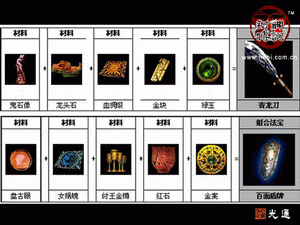 《 封神传说》中的“组合型”法宝可以利用打怪或者做任务得来的各种物品自己制作,只不过这些材料要收集起来并不是一件简单的事情。下面的图解是合成“青龙刀”和“百面盾牌”的例子,还有许多其他的法宝可以合成得到。