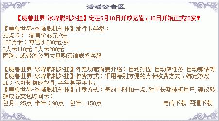 据网友反映,就在昨日,一个名为“冰峰”的“《魔兽世界》脱机外挂”粉墨登场,似乎率先填补了这项空白。登陆其网页,首先入眼的是其醒目的“公告”,看起来还真有模有样一般。