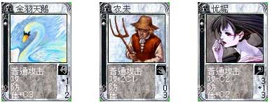一个高手不单单要拥有犀利进攻手段,同时也要身着绝对的防御技巧。图B是最典型的前期防御类型战斗牌。只能够抵挡2下1星战斗卡普通攻击。在前期防御回合,如果有图A装备卡,不用考虑了,立刻装备给图B战斗卡。这样在前期防御回合它一个人能够抵挡3次1-2星普通攻击。或者2次带装备的战斗卡普通攻击。该防御类型战斗卡牌最在不装备装备卡牌的情况下,最高防御里3点,体力2点。这3点防御力是非常重要的,如果对方的战斗卡无法破防的话。那么就会受到0伤害。这是相当厉害的。但是对手的战斗卡牌攻击力在5就会扼杀它了。同等级情况下+装备卡牌。1星战斗卡牌最高攻击6-8点。图B最高抵抗力为8点。如果对手运气真的这么好。达到攻击力8。那么只有认命了。但是如果达不到8点。那么它就会抵挡2张卡的攻击。抵挡2张卡牌的攻击这是很重要的,如果你的后面一张卡是攻击力6的带装备的2星战斗卡。那么它的体力一定只有4点。如果第二张卡是攻击在这张2星战斗卡身上。那么你就失去了下一轮的绝对主力。所有要学会取舍。不要在乎会失去一张带装备的防御卡。