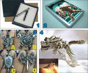 最后为大家献上一大堆PP的游戏周边,相信我,真的真的真的很赞!1:“传奇”的裁决挂链,2:“传奇”多功能烟盒名片夹,3:“魔兽争霸”四个种族的项链,4:“传奇2”泰国银巨龙戒指