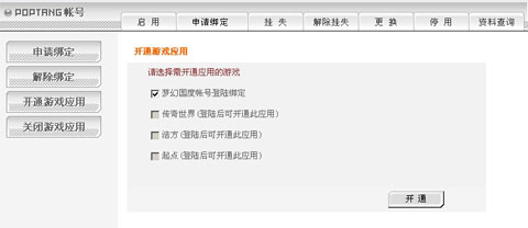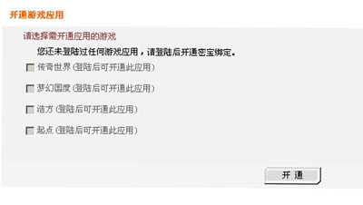 答:开通游戏应用时要注意,如果你从未登陆过该游戏,则必须先登陆该游戏的游戏界面,否则会出现如下情形,无法选择游戏进行绑定: