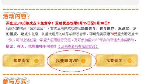 别忘了,现在密宝用户还可以加入盛大VIP的大家庭,享受超值VIP尊宠服务,点击“我要领奖”旁的“我要申请VIP”,即可成为VIP的一员。