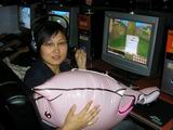 由于有的玩家来迟了没有机位,只好站在后边观战,指指点点,和大家一起交流了很多玩《轩辕二》的感悟和体会,帮助玩家度过难关,可谓是最辛苦的人。玩家凭借着高超的水平已经不俗的本领将充气噗噗、毛绒噗噗一一收入囊中。一位MM看到奖品一一送出,心急如焚啊!对男友使出了必杀技――“暴力”,折腾的男友苦笑不得,谁让MM是他唯一真爱呢?MM的“必杀”使得全场再次沸腾,难免网吧其他玩家也伸头瞧看个究竟。