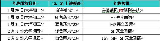 ◎活动内容:符合资格的玩家,只要2006年1月27日(腊月廿八)~2006年2月3日(大年初六)每晚9点上线均能获得红包一个,红包内可随机得到虚拟宝物。2006年1月29日(大年初一)~2006年2月2日(大年初五)每晚10点玩家在此时间之中上线,每天将会得到不同的好礼呦!!以下就是我们10点的礼物列表,请玩家看仔细了喔!!
