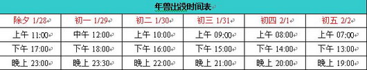 此消息一出,大批勇者便开始磨刀霍霍,希望能在这段时间内取得极为珍贵的座骑武器,身为勇者的玩家们,你愿意接受这个挑战吗??以下就是**所贴出的年兽出没时间表,玩家们可要瞧仔细,不要被别人捷足先登喔!!