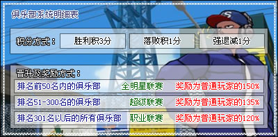 在俱乐部里随便打打,就会为自己的俱乐部带来积分。赢一场3分,即使输掉也能获得1分。随着积分的增多,将给俱乐部本身带来排行,排行情况可以在游戏内和官方主页查看,它能为俱乐部里的每位成员带来莫大的荣誉。排行靠前的,将使所在的俱乐部升级成为“超级联赛”或着是“全明星联赛”,而相对的奖励加成也会增加,在“全明星联赛”俱乐部中的所有玩家将获得经验及积分的150%加成,而在“超级联赛”也有135%的加成,玩家再也不用为积分学技能而发愁,不用频繁的比赛来提升等级,你会发现在俱乐部里一切是那么容易那么轻松,而带给玩家这一切的,是俱乐部里每位队员的不懈努力和坚定的团队精神。