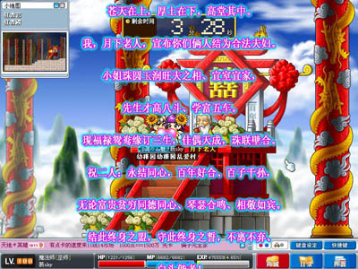 当时MU并没有开放结婚系统,但是游戏里有教堂,所以MU的结婚更加自由化,一大群的朋友到教堂参加婚礼,有公会或者见证这段感情的老朋友作为证婚人,这以后,他们就结为众人眼里公认的夫妻。别人都知道了暮暮是朝颜的妻子,朝颜是暮暮的丈夫。