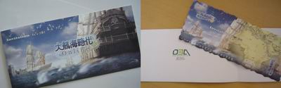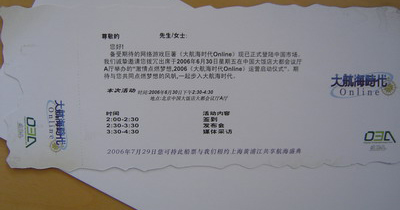 另外值得一提的是,在船票背面的正下方还印有“2006年7月29日,您可持此船票与我们相约上海黄浦江,共享航海盛典”的字样。盛宣鸣表示,7月底ChinaJoy之时,《大航海时代Online》将在上海为全国网络游戏玩家送上一份惊喜。不过具体是什么惊喜,盛宣鸣称暂时不便透露,但请6月30日参加发布会的到场宾客务必保留好这张船票,以免到时追悔莫急。