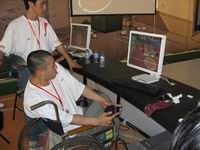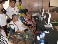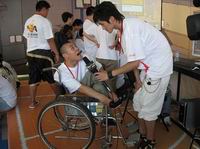 7月15日早上9点,CCTV-5“篮球公园”小组的工作人员早早就位,准备转播“街头篮球全国联赛沈阳赛区”实况。这时,一位特殊的选手坐在轮椅上,在两位队友的“推送”下,从容登上了比赛中心场地。这位特殊选手的登场,引起了全场的好奇,工作人员立即上前对他进行了简短采访。