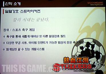 本月23日,韩国MGAME公司在召开的MGAME新蓝图发布会上,了足球版《热血江湖(专区 下载 账号注册 搜狗 热血江湖说吧)》——《热血江湖Strikers》。