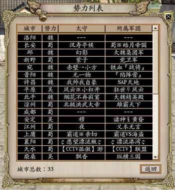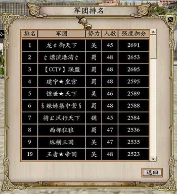 经过一周四场激战,各城也都有主了,让我们一同盘点公告栏,认识一下在上周中取得优异成绩的军团和英雄榜上的牛人吧!目前以蜀国占领的城池最多有14城、其次是吴国9城、最后是魏国7城,在军团排名方面争取十分激烈,目前的冠军为吴国的龙¢御天下,人数45人、强度积分2691;而蜀国48人的大团“ξ漂流港湾ξ”也仅仅以2653的强度积分紧追不放占据亚军的位置,季军蜀国的“【CCTV联盟】”军团,更以强度积分2605的微弱劣势屈居!在这动荡的局势下,和军团的排名会有更进一步的变化吗?其它军团会后来居上吗?让我们视目以待吧!