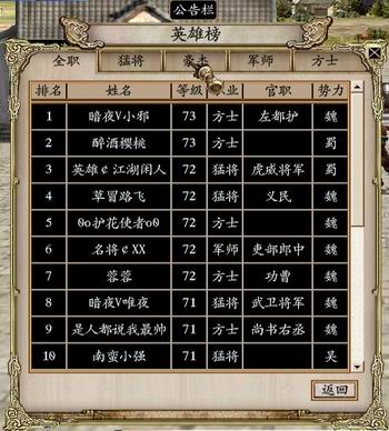 在国战排名方面魏国“¥小虫¥”以讨218人,功勋1400而居首位、蜀国“三国专卖”讨485人,功勋1196屈于次席、第三名为魏国“草冒路飞”,讨敌428、功勋1138。在英雄榜方面,更是让人惊喜,排名榜上冠亚军不再是以威力强大的功击力和防御力著称的猛将,而是由以长距离、大范围华丽招式战斗的方士取代,第一名为73级的魏国“暗夜V小邪”、接着为73级的蜀国“醉酒樱桃”、第三甲为72有的蜀国猛将“英雄¢江湖闲人”,希望他们能再接再厉,其它各职业的玩家们,也要加油啊!