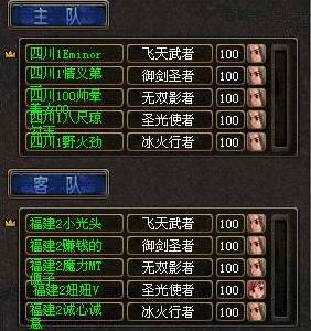 这场比赛,主队是来自飞升外测时PK战冠军广东5,客队是来自湖南1区的冠军家族海纳百川!湖南1海纳百川全阵化身枪手,势压广东5风魔,但是在圣战面前实力才是最主要的,广东5风魔5队员中冰火行者,无双影者,飞天武者各带神宠—九眼妖虎,大有冠军风范;天下第三贱前相战,实力直逼湖南1海纳百川,速度解决掉湖南1海纳百川的飞天武者/圣光使者/冰火行者,湖南1海纳百川的无双影者隐身逃走,只身留下的御剑圣者终因状态被消,轻而易举的被广东5风魔拿下,湖南1海纳百川因此陷入了1V5的困境,遗留下的无双影者,最终现身爆死于广东5风魔家族的群刀乱剑之下!
