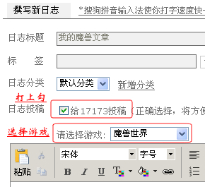 二、进入博客,撰写日志时,只要在[给17173投稿]前打上勾,和选择好投稿的游戏即可。(如上图)