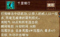 打狗棒法之千里横行——打狗棒法中级武功,以惊人的威人以一应多,而毫无凝滞的犀利招式。当混战在一起的时候用此技能效果不错,面伤范围大,且攻击力不弱,最重要的是吟唱时间比较短。