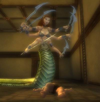 “哼,黄泉之路的花朵——彼岸花!” 远处的荒凉戈壁,一个面色漠然的女性突然冷冷地哼了一声,扭尾和同伴消失在黑暗之中,隐约间看见她身上的绿色鳞片和周身散发出的“女王”字样。不错,在情侣们正着浪漫的心情在城中散步之时,也唯有天性暴戾的“六臂蛇魔”会对神秘凄凉的彼岸花之说耿耿于怀。