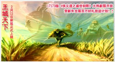 2007年2月12日12时,永久免费网游17173版《侠义道之盛世初歌》电信新服“王城天下”正式开启!新服,新的江湖,新的机遇,真正的真武侠网络,一切等你探索!