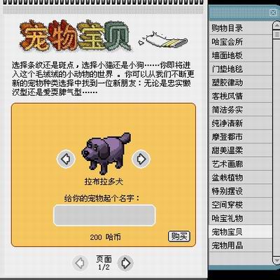 在万众期待当中,哈宝宠物已经开始上架销售了!在购物目录的最后两个类别分别是宠物宝贝和宠物用品。在那里,你可以挑选你心仪的宠物和各式各样的宠物食品及玩具。无论是小巧玲珑的猫咪,还是忠诚可靠的小狗,你都可以在“宠物宝贝”的栏目中挑选得到。此外,小狗和猫咪还有多个品种哦,任君选择。当你选择好自己的小宝贝以后,可别忘了替它改一个名字哦。然后到“宠物用品”里头,选择你喜欢的颜色的水碗,和各种各样具有特色的宠物食品。此外还有多种颜色的小球,可以为你的小宝贝解闷。当你正式选择好了以后,就可以把它带回家了!你可以通过各种宠物的指令,让它作各种动作。但是因为宠物跟它的主人有特殊的感情,有些指令,是只有主人才能使用的哦!发指令前,别忘了先喊宠物的名字。以下,是一些宠物指令: