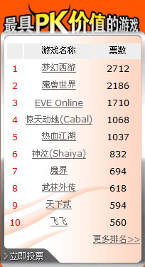 新《魔界》中的PK元素丰富而刺激、引人入胜,在17173的网游风云榜的“最具PK价值的游戏”中排名名列前茅,充分证明了新《魔界》的PK价值。无论你是喜好何种PK方式的玩家,都可以在新《魔界》中得到最为爽快最为纯粹的PK乐趣。喜爱新《魔界》的玩家请点击这里http://mnd.17173.com/为新《魔界》投票。