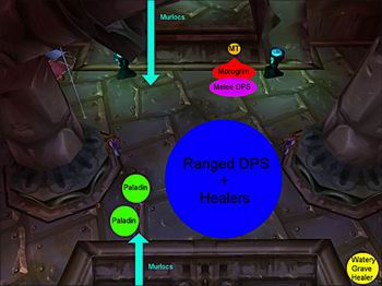 任意一个治疗站在上图所示的右下位置,治疗那些受到水之坟墓伤害的成员,如果他是一个圣骑士,他的仇恨必须和普通治疗一样而不是去吸引鱼人的仇恨。