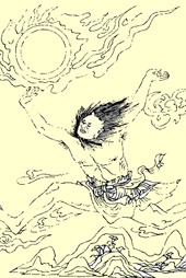 “夸父逐日”讲的是上古时期,神人夸父追赶太阳,最后被太阳烤死的故事。古籍《山海经》对此有详尽描述:“夸父与日逐走,入日,渴欲得饮。饮于河、渭,河、渭不足;北饮大泽,未至,道渴而死。弃其杖,化为邓(桃)林。”这段记述是说:夸父追赶太阳,追至太阳身边,因炎热而口渴,喝干了江河仍嫌不足,于是,欲饮沼泽之水,未等喝到,不幸渴死。手杖弃于路边,竟长成一片桃林。