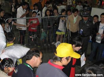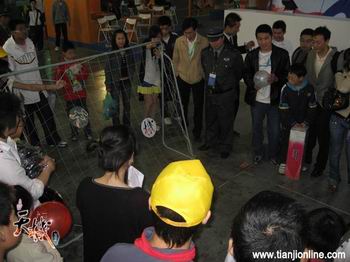 射门游戏以“天”,“机”两块圆牌为目标,在拉起的球网里谁能命中目标,就将从showgirl手中获得丰富的奖品。规则虽然简单,但要实现还是需要有“小贝”那样出神入化的脚法噢!