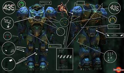举例来说,当我们确定了宣传片的设计思路后,开始逐步充实整个步兵被制造出来的细节过程。我们确定了作为主角的步兵是Tychus Findlay,一个将在《星际争霸II》中被重点描绘的角色。最后进入角色的创作过程,我们在这个步骤里要赋予Tychus一个完整确定的性格特征,并通过逐步的完善来使影片中的这个角色看起来更加丰满和真实。