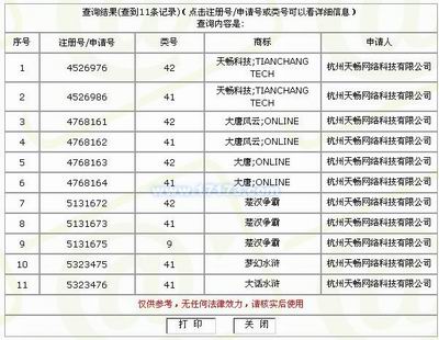 同时,根据国家商标局的数据库记录,杭州天畅网络科技有限公司分别在第9,41,42三个类别上先后申请过十一个商标,名称分别是:天畅科技TIANCHANG TECH,大唐online,大唐风云online,楚汉争霸,大话水浒,梦幻水浒。