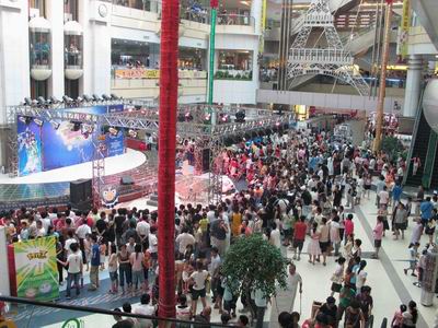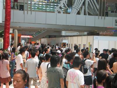这是嘉年华武汉站《疯狂赛车(专区 专题 搜狗 说吧)》姐妹挑战赛现场,一位年轻的妈妈带着一位小男孩在玩《疯狂赛车》: