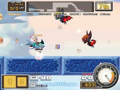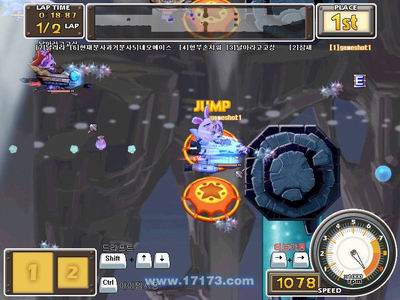 游戏也具有竞速游戏所具有的内容,如有能量时可用能量进行快速前进,还能通过漂移键进行快速的垂直移动。通过地图上的箭头标志,会在一定时间内获得加速效果,通过跳台时能进行跳跃。移动则使用键盘进行,向前键加速,向后键减速。总之操作比较简单。