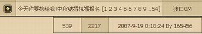 自“今天你要嫁给我!天机中秋结婚祝福报名”活动开展以来,玩家踊跃,气氛火暴异常。截止至本新闻发布时,该报名帖的点击已经达到2217,回帖数达539,楼层更是已高达540,即整整54页。