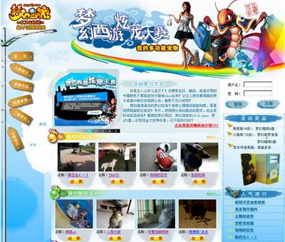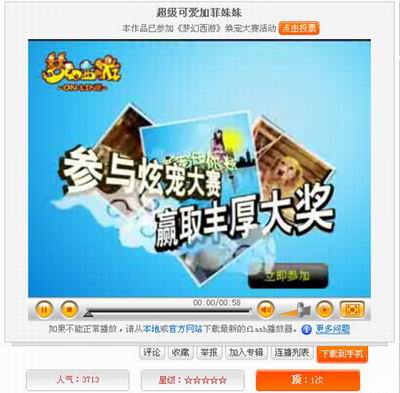 拥有可爱,拉风宠物的主人们,无论是在游戏里,还是现实中,都喜欢炫一把!“梦幻西游炫宠大赛”给你和你的宠物一个最炫的平台。把你心爱宠物(游戏中的召唤兽,或者现实生活中的宠物)的有趣视频上传到活动网站,就有机会获得千元大奖咯!奖品包括梦幻精美周边,梦幻iPod nano,梦幻U盘,还有现金大奖!