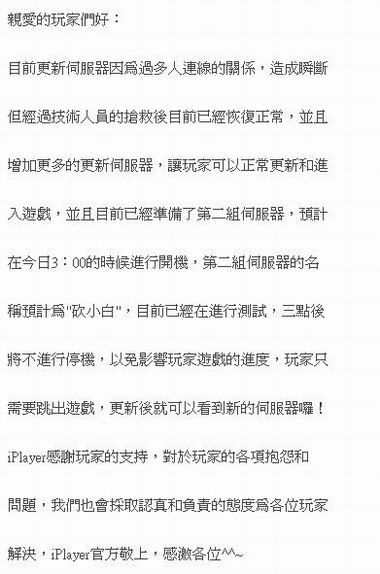 鉴于此种情况,iplayer台服官方既喜且忧,急忙紧急征调准备了第二组服务器,准备在15点的时候紧急开机,从而达到让玩家分流,减轻第一组服务器负担的目的,避免再次出现服务器被挤爆的状况!