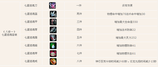 这套装的强大功效,是来源于蕴涵在各个部件中的地之精华晶玉,缺一不可。故此,不完整的“七星追魂”,其能力就要大打折扣了。有鉴于此,这里搜集了该套装的资料,略可一观: