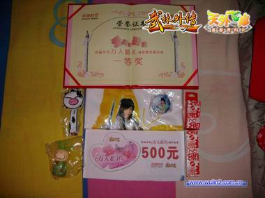 这就是六扇门捕快“彼岸如雪”和朋友一起赢取的一等奖和其他活动奖品。荣誉证书、五百元现金、T恤衫、小镜子、钥匙扣、毛绒熊……是不是很诱人?