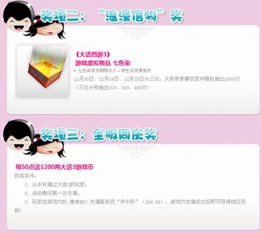 “结情大话,浪漫欧洲”刚刚开始2周,就得到了大话玩家和旅游达人们都热烈追捧!大话网络结婚证铺天盖地的飘洒过来!而第一批的浪漫大奖也在这个火爆而又浪漫的气氛中诞生啦!!大话3玩家"嗜血圣君"、"嗜血冰蓝"将享受阳光、沙滩、椰林的海南游,300对大话3玩家彼此交换“浪漫信物——七色染”![《大话西游3(专题 截图 搜狗)》游戏虚拟物品“七色染”获奖名单,请查询。12月5日系统维护后也将通过游戏内系统邮件的方式通知获得“七色染”的各位玩家。]