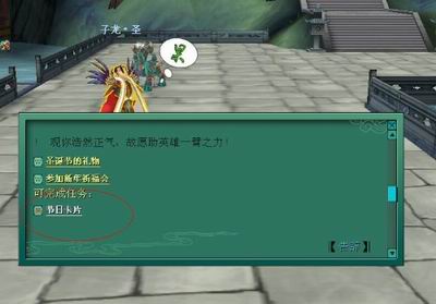 当玩家接受任务后,请选择飞行回到真武殿,找到子龙.圣换取卡片礼物。